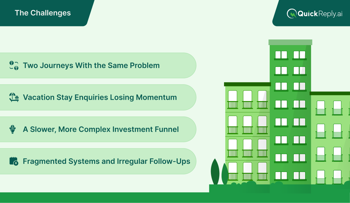 Both the vacation stay funnel and the investment funnel relied on manual communication. The team shared details over WhatsApp, email and phone calls. When responses were delayed by a few hours, both bookings and buyer intent dropped quickly.