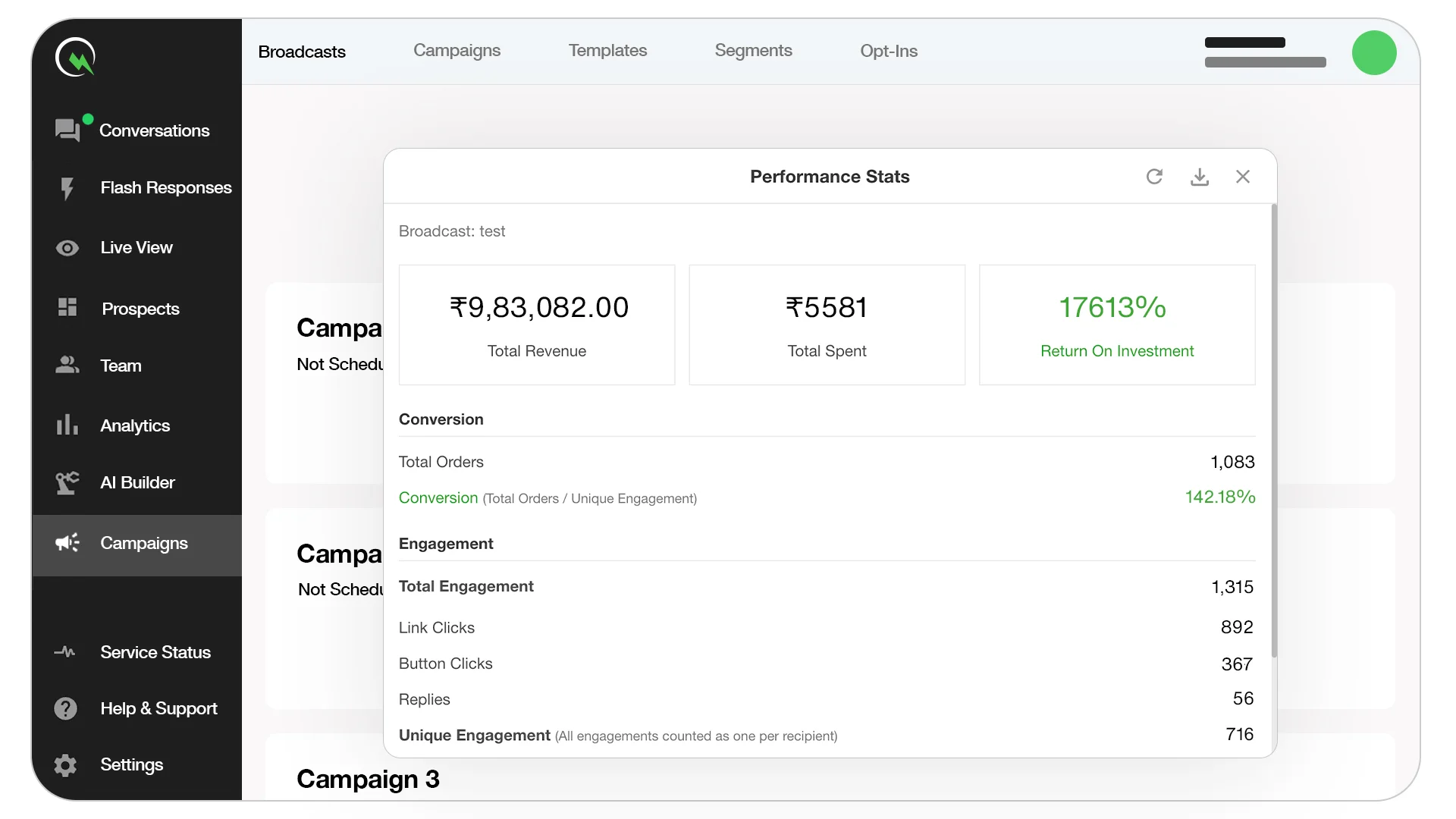 2 - Revenue Attribution: QuickReply.ai takes the guesswork out of your WhatsApp marketing campaigns by providing detailed analytics that matters. With the platform, you're not just collecting data; you're gaining insights to drive your business forward. You can see exactly how your ad spend translates into sales with the Return on Ad Spend (ROAS) feature, ensuring your marketing budget is always an investment, not just an expense.