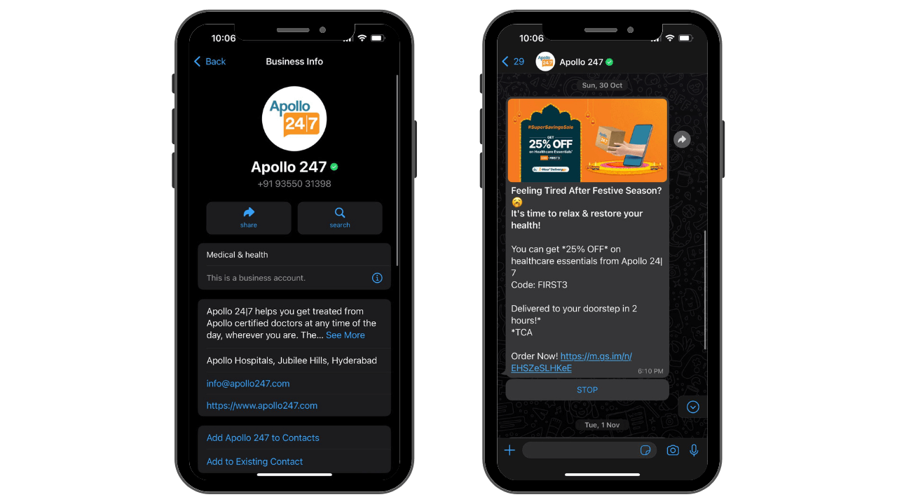 If you look at their display name, it has "247," which doesn't make sense if we see it from a literal perspective. Using "24/7" would've been a better option. But because WhatsApp doesn't allow the use of additional symbols, they have to stick with "Apollo 247."