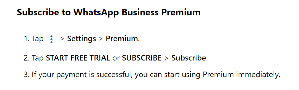 The WhatsApp premium plan covers all advanced features required for growing small businesses to thrive. With this plan, businesses will effectively handle customer queries by connecting with ten devices. WhatsApp also provides a 30-day free trial for businesses to test premium before taking up monthly subscriptions.