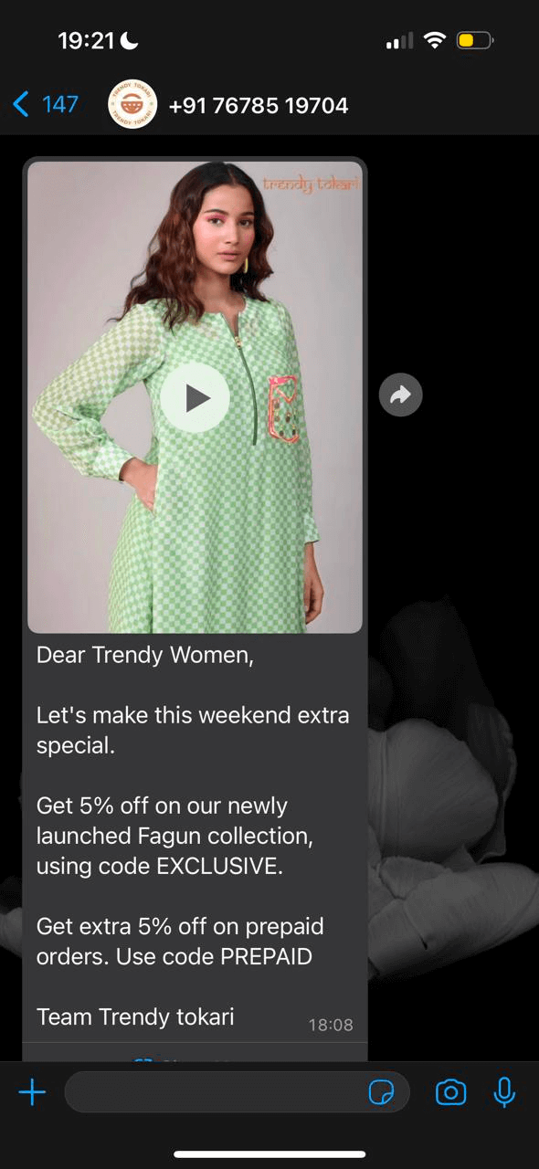 While the sneak peek videos mentioned earlier would help create hype around your product, a launch video WhatsApp broadcast message would help in direct conversions immediately. This is when the launch has happened and you want your customers to make a purchase then and there.