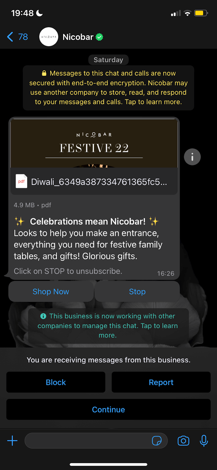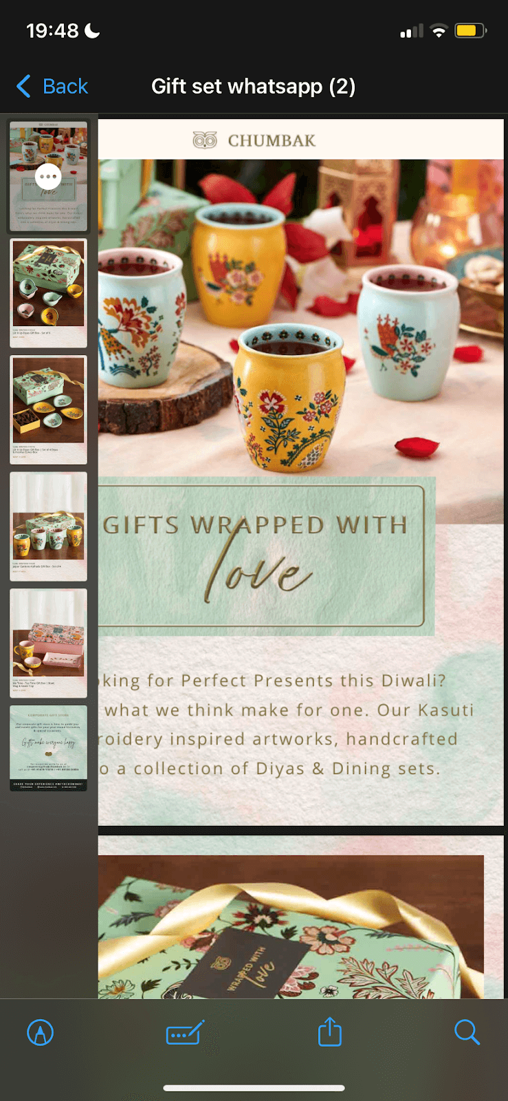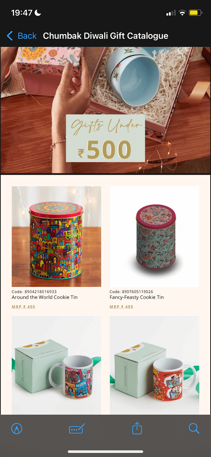 A home decor and accessories brand, Chumbak is making the most out of the festive season of gifting by creating multiple lookbooks around gifting ideas for Diwali. They use WhatsApp broadcasts to send over these lookbooks to all their customers, to inspire more online shopping for the season.