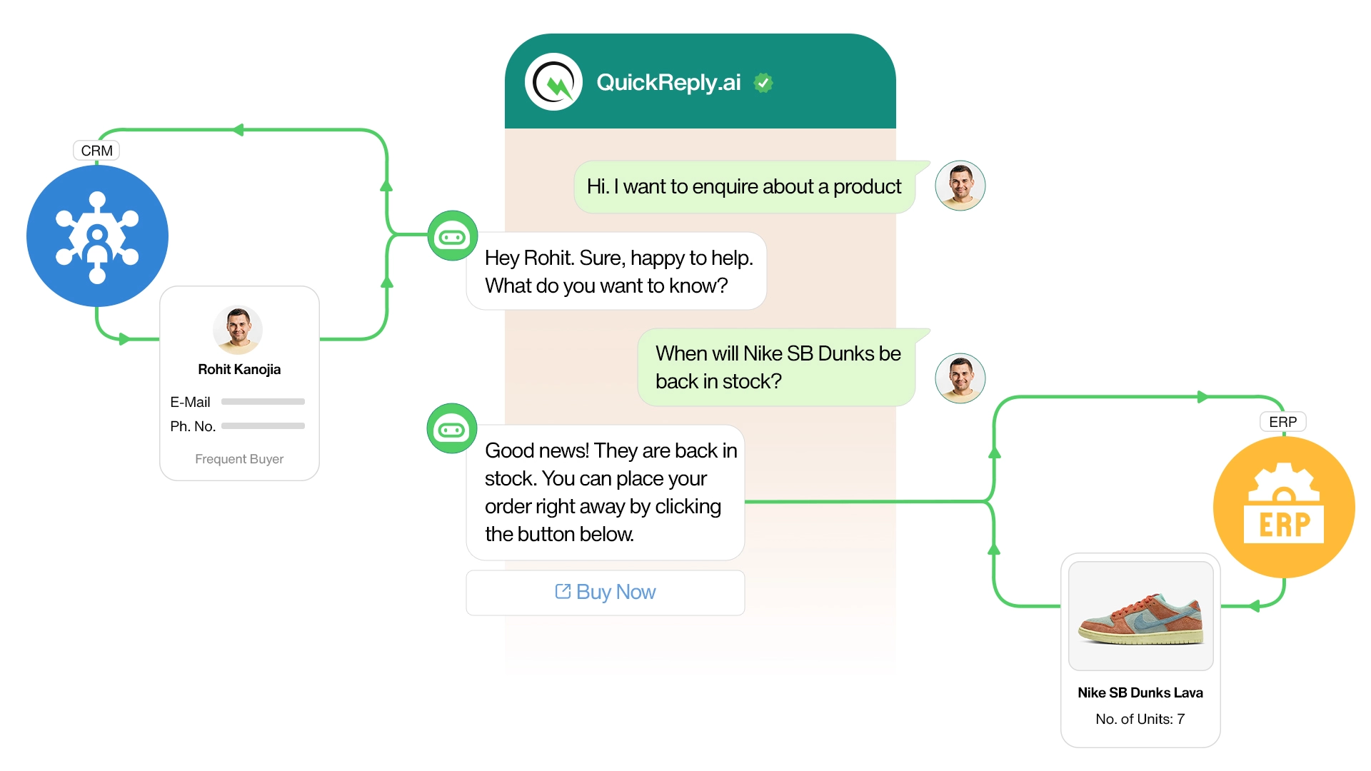 Connecting to CRM and ERP:Imagine a scenario where a customer inquires about a product's availability through a WhatsApp chatbot. The chatbot, integrated with the company's ERP system, instantly accesses inventory data to provide a real-time answer. Simultaneously, this interaction is logged into the CRM system, updating the customer's profile with their interest in this product. This integration ensures sales teams can follow up with tailored offers, enhancing the sales process.