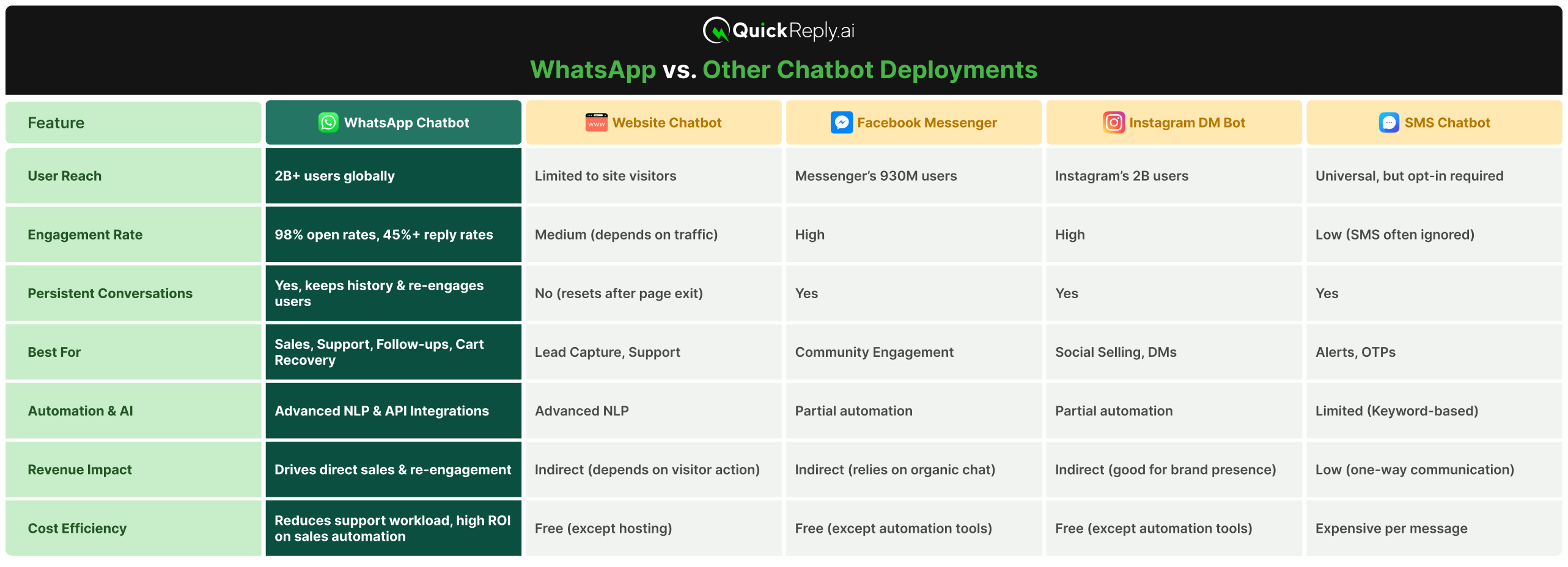 Unlike a website chatbot that depends on a user staying on your site, WhatsApp chatbots persist beyond a session. If someone leaves your site, you can still message them, re-engage them, and even close the sale hours or days later.