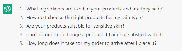 Prompt: 5 FAQs by customers from a eCommerce skin care brand
