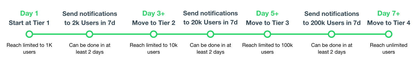 In the above example, a business with a messaging limit of 1000 conversations increases its limit to 10,000 by messaging a total of 2000 unique users within a 7-day period. These unique users are the number of opt-ins you get during the period.