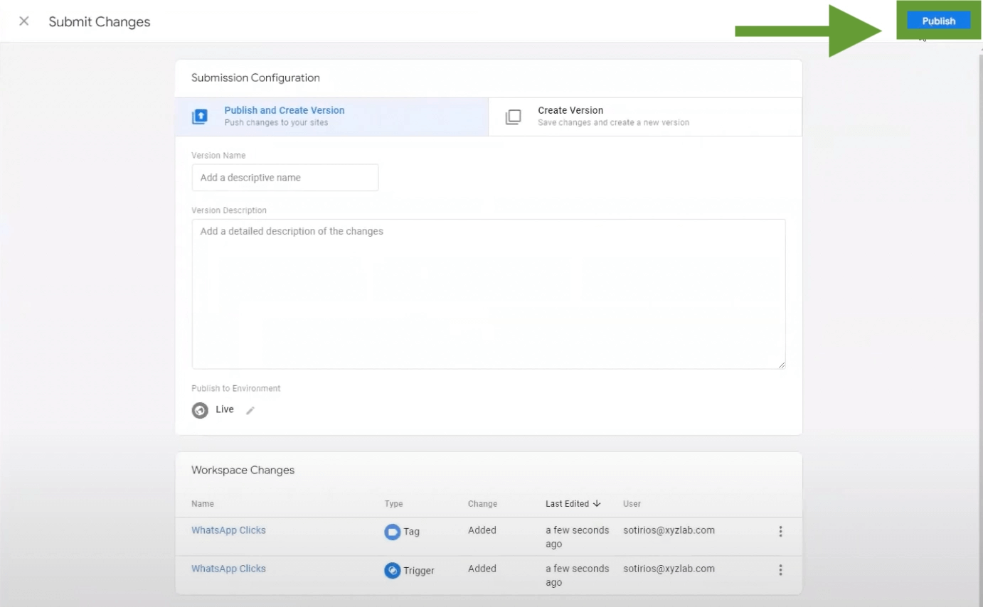 Finally, submit and publish your container to activate the new Tag and trigger, and start tracking clicks on the specified link.