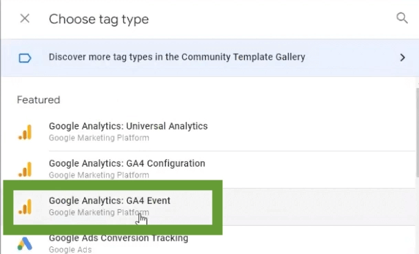 Select Google Analytics: GA4 Event in the Tag Configuration.